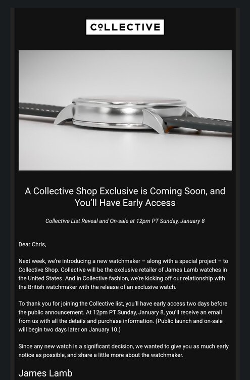 Just received a notice that Collective will be announcing a new collaboration with James Lamb. Very excited to see this new project and I'll update with photos.