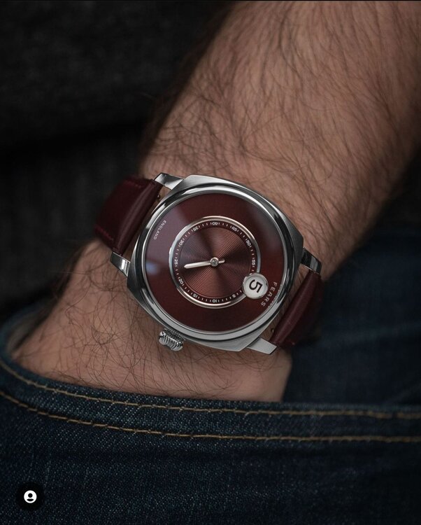 https://www.fearswatches.com/en-us/pages/alliance-01 The Alliance 01 is housed in an entirely new 40.5 mm Brunswick case made specially for this watch. With the same beautiful, expert finishing as the rest of the Fears collection, the Alliance 01 sits comfortably on the wrist, slipping under a shirt cuff with ease. Powered by Christopher Ward’s in-house JJ01 jumping hour module, the hour is displayed in a window at 12 o’clock in a bespoke version of our “Edwin’ typeface, with minutes indicated by a conventional hand. Photos from IG @fearswatches