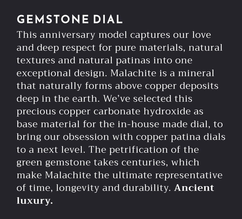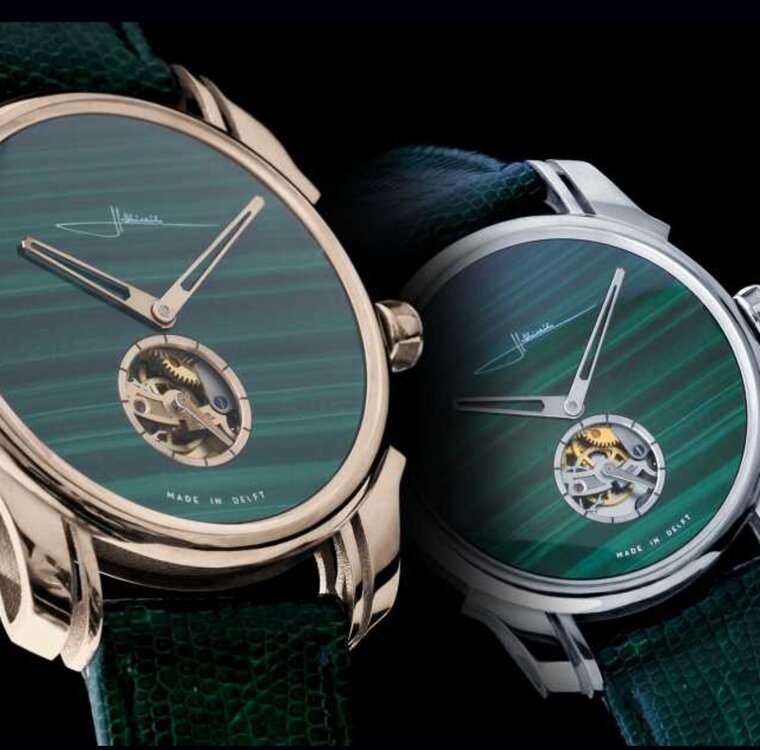 6. https://holthinrichswatches.com/collection/ornament-1-malachite/?fbclid=PAAaYVjeOQ7JYMNmyNGFVTzktwIEWP8jaO27FPqrjm07DXW_l3v7mGXBb0lww Holthinrichs announced a new, limited edition 10 year Anniversary with Malachite dial and skeletonized design. The Anniversary Edition centenary 10 years since Michiel Holthinrichs followed his dream of designing and creating his own timepieces. The Anniversary Edition comes in gold or stainless steel and is limited to 5 pieces each.