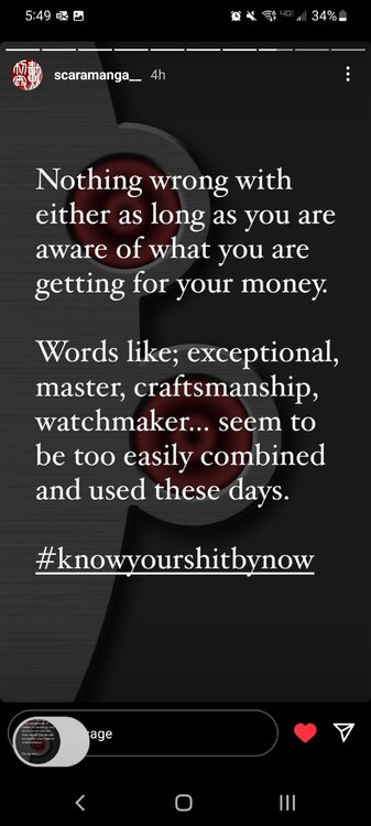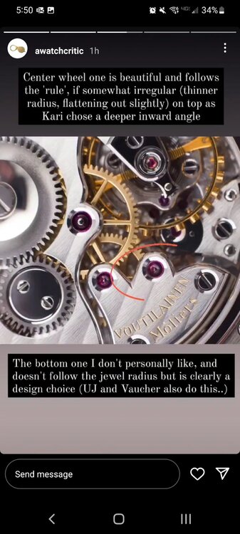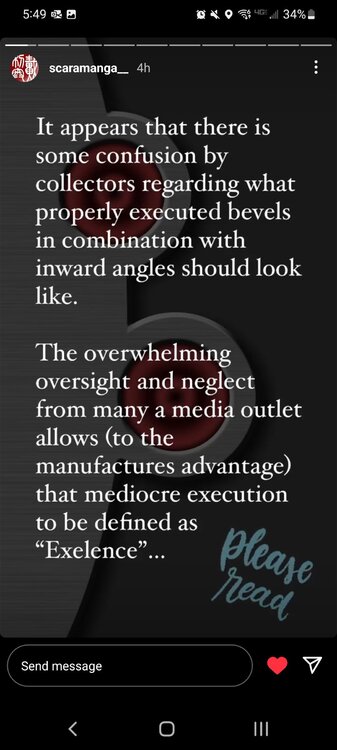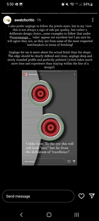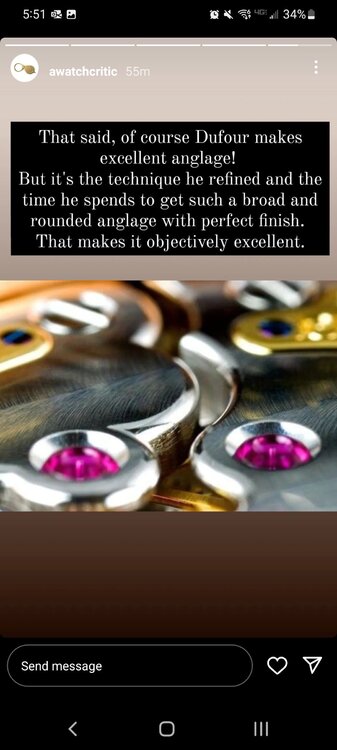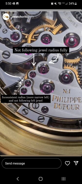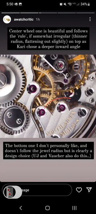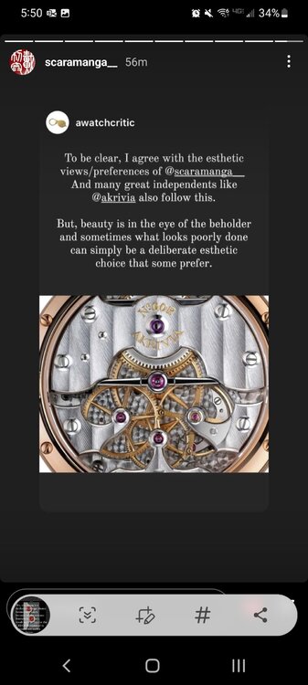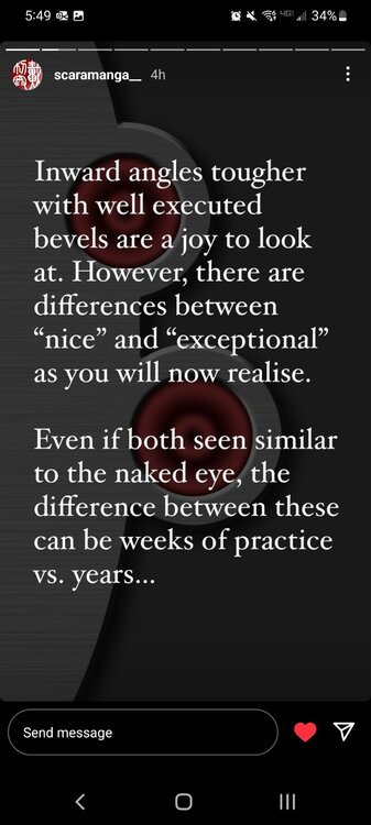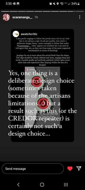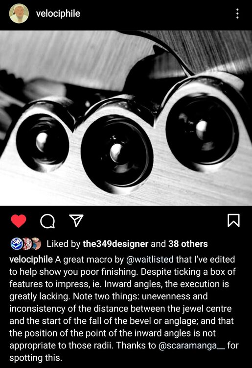 IG: @scaramanga__ made a post about properly executed bevels in combination with inward angles. @awatchcritic provided a response. I figure its worthy of discussion, so posting screenshots of the conversation (with permission from both) below. Where do you fall? I have to say I understand both points. But I think taking a hard line on This Good, This Bad probably over simplifies the issue and there is some element of artistry and design that could lead to the less symmetrical interior angle and beveling. And in some cases it may be due to limitations by the watchmaker, but not as an absolute. Art the end of the day, I believe people should buy what they want at the price they are willing to pay. And if it's beatiful and excellent to them and they feel they got the value they paid for, then who am I to argue or convince them otherwise. To each their own.