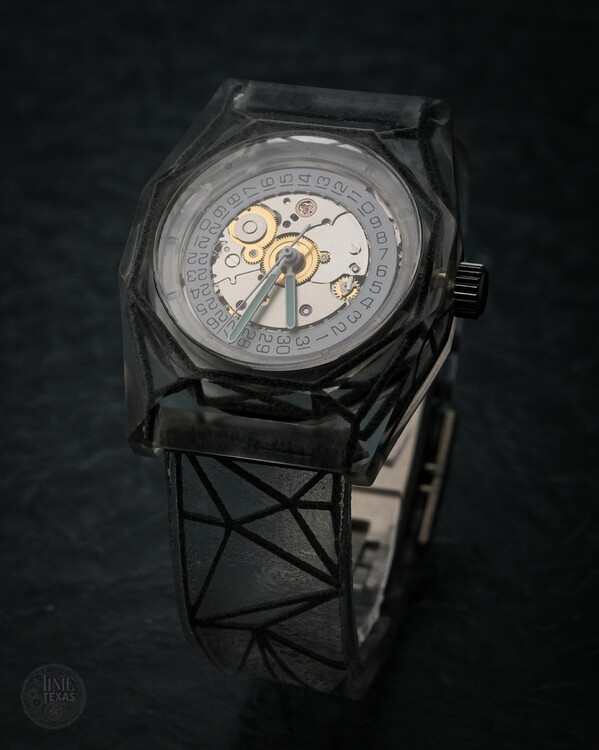 9. Added another from Resin Watch Labs. From https://resin.watch/ subcutaneous: meaning situated or applied under the skin - SUBQ references 2 aspects of the watch, the manufacturing and the design. manufacturing SUBQ's are made using reaction injection molding. this is a subcutaneously injected urethane reaction into a soft platinum silicone mold of the watch case that has been pre-loaded with a nylon skeleton. this has to be done cognizant of gas infiltrations and within 3 minutes of the reaction. gas infiltrations can be intentional, the result of higher atmospheric humidity, or occur by poor technique of the subcutaneous injection method. the result of such a volatile process is a graveyard of rejects. not every injection process yields the demanded results and while variables can be tuned, there is a luck aspect. similar to how enamel dials are made, however there is significantly less chance of running a hypodermic needle through your hand in that process. design SUBQ also references the subcutaneous skeleton seen in the case body and the strap. the 3d printed nylon 12 skeleton is pre-loaded into the mold before the manufacturing reaction process of the case body. this skeleton provides a reinforcement of the strap and a visual design nod to the previous previous iteration of resin watch design, an octagonal case. the watch is a reverse monobloc case (reverse monobloc is made tf up but I'll explain it in a sec) powered by a ST2130 movement in a 60 psi forged urethane body that withstands 6 bars of pressure underwater. reverse monobloc (see i told you I'd explain it) means the case body is formed directly to the front crystal to get a pressurized and seamless fit. the case back is then gasketed and press fit. to service this watch or open it, follow the instructions that you would for any monobloc case watch. be sure to press the front crystal down on the table and wrap the watch case in a towel so the back crystal doesn't fly off when pressurizing the case body. Very cool and different.