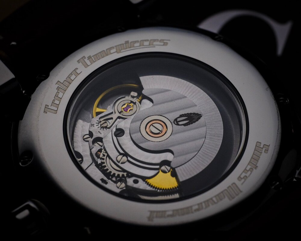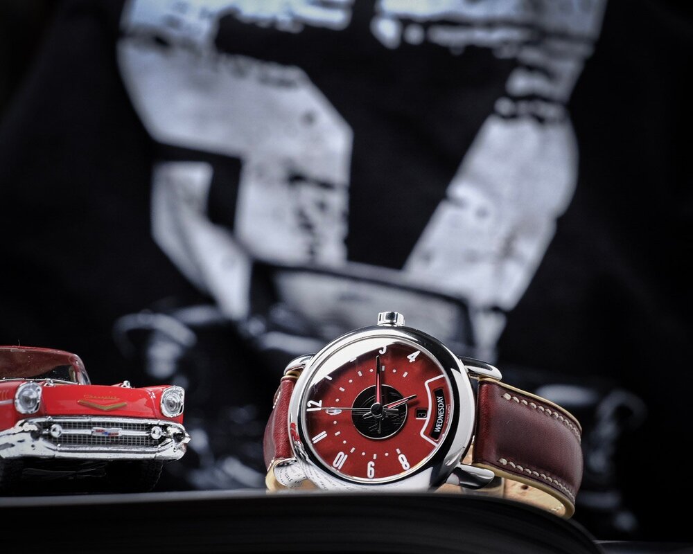 A watch driven by the childhood aspirations of its designer to rebuild classic cars. Like the movement in a mechanical watch, the engine in a car is the heart, beating away and keeping it alive. But there's more than just the movement or engine that keeps it running. As anyone who loves cars can tell you, there's a soul that sparks the spirit and passion of car collectors. No car captures the American spirit moreso than the 1957 Bel Air. The striking curves and aggressive lines encapsulate the soul of classic American carmaking. Hermann Kugeler, the man behind Treiber Timepieces, has been re-building classic cars since he was 13 years old - before he could even drive. A mechanical engineer by trade, Hermann has turned his focus to and alternative hobby - designing and building watches. His first watch, the T57BA, gathers inspiration for the 1957 Bel Air and reconstructs it into a curvy and sexy timepiece. Inspiration for watch designs can vary. The issue with any overt inspiration is trying to marry two existing, and divergent, designs. The results can often result in an incoherent and disjointed mishmash between competing elements. That isn't an issue here as the watch was designed from the ground up using the elements of the car as inspiration. When you think of a '57 Bel Air, you think shiny, polished chrome, rounded curves, and analog controls. More aggressive than sleek, its low and muscular appearance evokes power and bold design choices. The T57BA captures that same feel. With its rounded case, large domed crystal, and polished stainless steel case sporting two different styles of lugs, the feeling is both modern and classic at the same time. And yes, you read that right, two styles of lugs. The roof line of the Bel Air is one of its most striking features of the car and they are captured beautifully with the lug design. One set of lugs is thinner and slopes more gently and another that is a more rounded and curved down. This was not an easy decision and Hermann wasn't sure it would work. And while its certainly unconventional, it doesn't afffect day-to-day wear. Just a quirky and fun reminder of the underlying inspiration. Its doubtful anyone would notice while you're wearing unless you are specifically pointing it out. The push-pull crown, inspired by the knob to turn on the headlights, isn't the easiest for gripping and pulling out, but the curvature of the case makes this easy work and a non-issue. The crown is signed with the Treiber logo. The dial design truly shines, mimicking the classic cars' speedometer display. Smartly done, the hours are printed on the inside of the crystal from 8 to 4, replacing the MPH. It adds a nice 3D element to looking at the watch. The gear shift indicator has been transformed into a day indicator. The dial is nearly a minature version of the drivers console with the requisite changes to indicate the time rather than the speed. You can see the similarities in the photos below. The red-lumed hands look fantastic and emulate the speed indicator. As red lume is prone to do; however, it fades quickly. But it does look fantastic and I think consistency of design was more important than making a watch to win a #fridaynightlumebattle. The hour markers on the dial appear to be applied lume and this is probably why these markers aren't as crisp. I know this is something Hermann is looking into different solutions and will hopefully result in a solution. The printing on the crystal is fine on the wrist, but under closer scrutiny is slightly inconsistent with some numerals not being quite as crisp as others in places. These are the only two minor issues with an otherwise wonderful and unique design. I didn't find either issue to be an issue while wearing the watch, but they were noticeable while taking photographs and something you should consider if you're a louper. The mirrored center of the dial is another great design inclusion to be consistent with the car. I have to admit I was a little worried at the listed size of 45mm. In talking with Hermann, this was a conscious decision to have a larger, modern size that has a significant presence on the wrist. Kind of like driving down the road in a Bel Air, you're going to get noticed, and again I think this was the right choice. And on my 18cm wrist (7"), it didn't feel too big in the least. My preferred size is about 40-41mm, but similar to my 43mm Moser, the design of the watch and the lugs makes it very wearable. I'd say it wears on the wrist about the same size as the Moser which i find to be a fantastic larger size and extremely comfortable. It fits the overall aesthetic and proportions of the watch. It also allows the dial room to breathe so everything seems properly spaced even though there's a fair amount going on. The watch is held in place by an excellent custom leather strap and deployant buckle that is signed on both the outside with the brand name and inside with the logo. Small wings where the strap attaches to the buckle let's you tuck the strap in and adds security. I'm not a huge deployant fan, but the execution on this definitely made me forget about that. It's extremely well executed. Besides the signed crown and buckle, the dial includes the Treiber logo at the 12 o'clock in lieu of the Chevy logo. And instead of an Odometer on the central plate, Treiber is inscribed. Again, everything fits into the original design elements but the spacing seems even better and less cluttered than the original speedometer. As for the watches heart, its a modified STP4-13 with outer day-date. The movement can be wound manually, or pulled out and rotated clockwise or counterclockwise to adjust the day or date respectively. Pulling the crown all the way out lets you adjust the time. The rotor is signed with the Treiber logo. There's definitely a place in the world for truly inspired design and the T57BA absolutely fits the bill. This is a great looking watch with incredibly thoughtful design. Hermann may be 